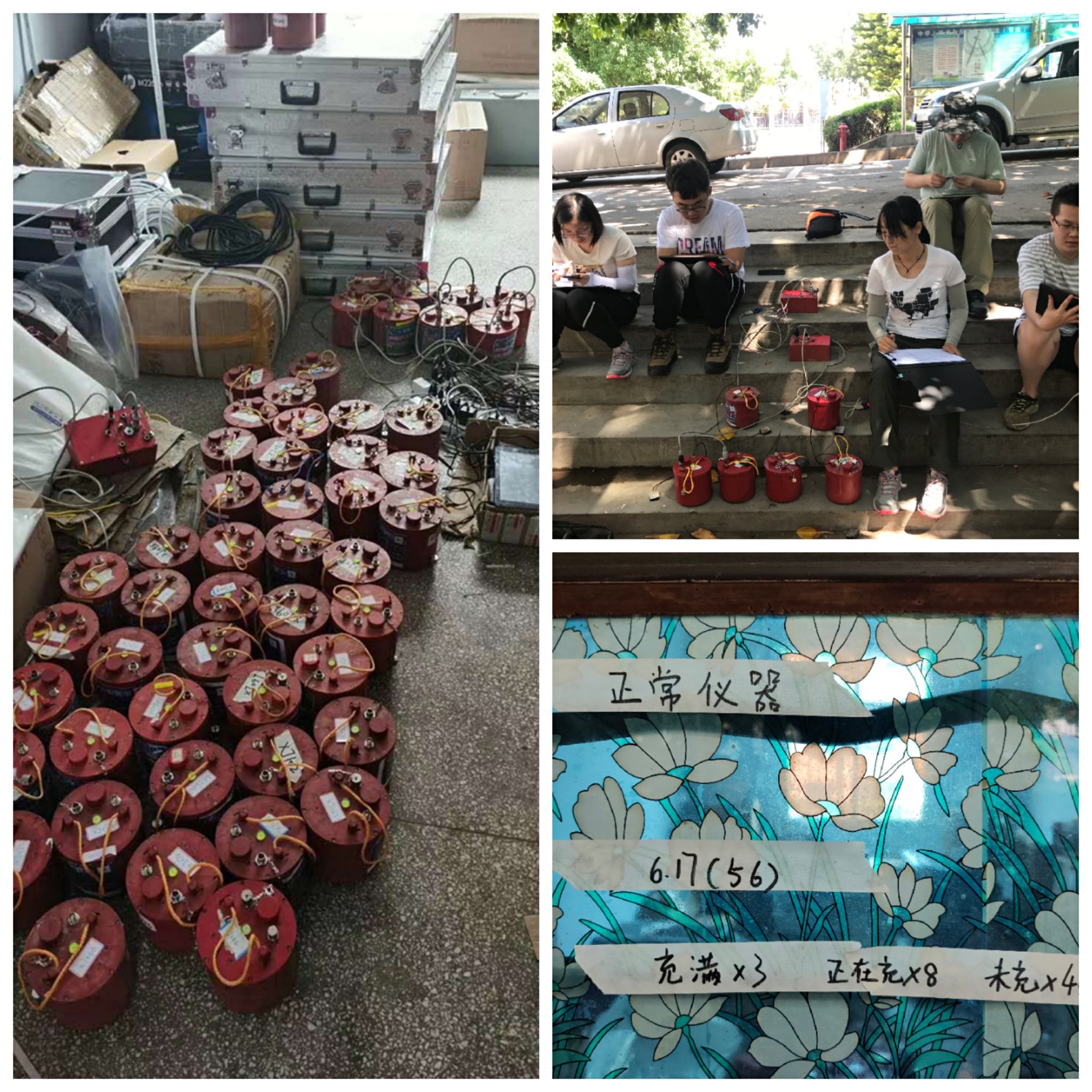 野外人员集齐之后,我们将西昌地震中心站作为“大本营”进行了仪器集中清点, 充电和测试工作,以对于野外真正能用的仪器数量做到心里有数。我们采用的仪器为QS-05A 便携式数字地震仪(本文简称“小红罐”),是一种方便布设、性价比高的短周期地震仪。仪器清点实际上是一项很繁琐的工作,不仅仅是仪器本身的数量,还有不同类型的电池、数据线和GPS。测试和充电也同样考验着我们的细心和耐心,为了加快整个流程,两者同时进行。测试的主要目的是考察仪器的蓝牙、GPS以及波形记录是否正常,这为实际野外布设节省了大量的时间。测试以“多进程”并行方式进行,每个人负责多台仪器,大大加快了测试速度。每天的工作进程会小结在储存室的窗户玻璃上,一种方便快捷的方式也别有一番风味。