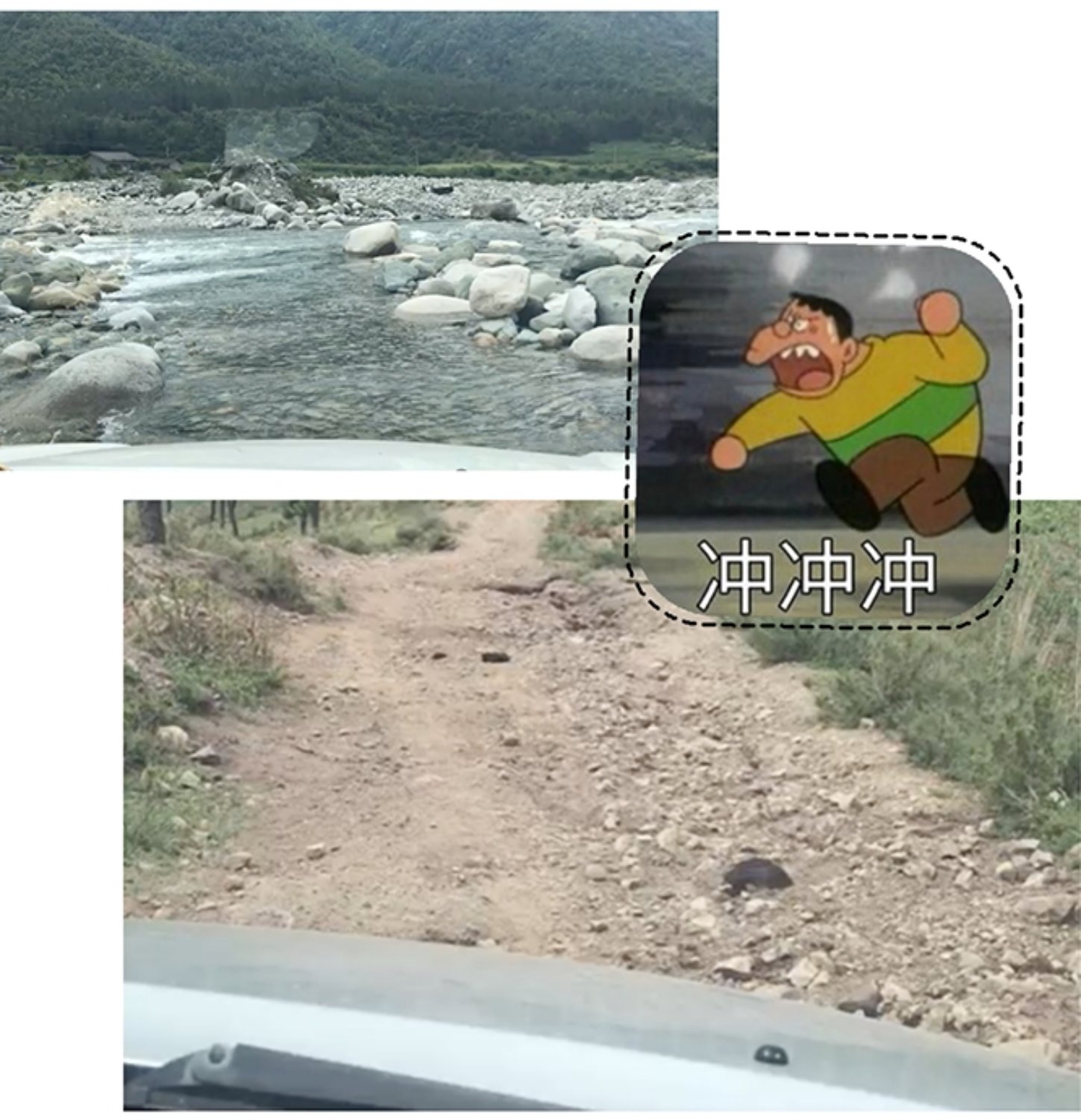 “布设”则指的是真正的出发上路,前往目的地并进行仪器的安装。野外工作的大多数时间实际上是花在路上,对于短周期地震仪来说更是如此,安装的过程顺利的话大约只需要半小时,但台站距离我们的“大本营”可能要几个小时的车程。我们的台网属于大凉山范围内,沿途的风景是如画般的蓝天白云。由于大凉山附近特殊的地形,山谷等路好走的地方很少,大多是要翻山越岭才能到达我们的台站位置。沿途也是苦难重重,不乏横跨河流、颠簸行驶石子路10km等艰苦道路,真真是“跨过山和大海”。