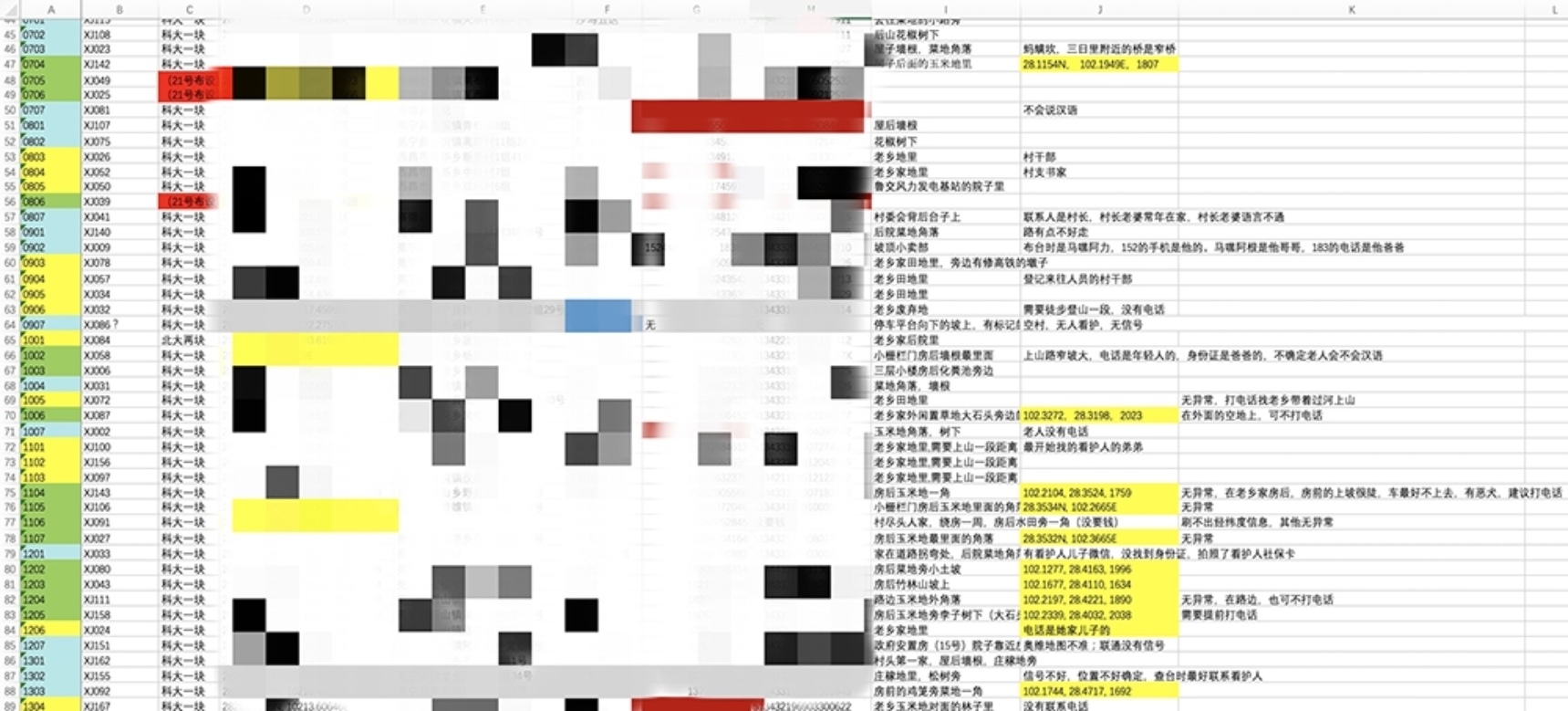 为了保证仪器尽可能多的正常运行,我们在布台结束之后紧接着进行了一轮抽样调查,挑选一半台站进行运行情况检查。过程与布台基本相同,差别在于只需蓝牙连接仪器检查状态即可。最后所有点位的相关情况都进行汇总,尽可能详细的描述点位特征以方便下次查台寻找。五颜六色的汇总表格凝聚了所有参加布台工作的学生老师的心血。