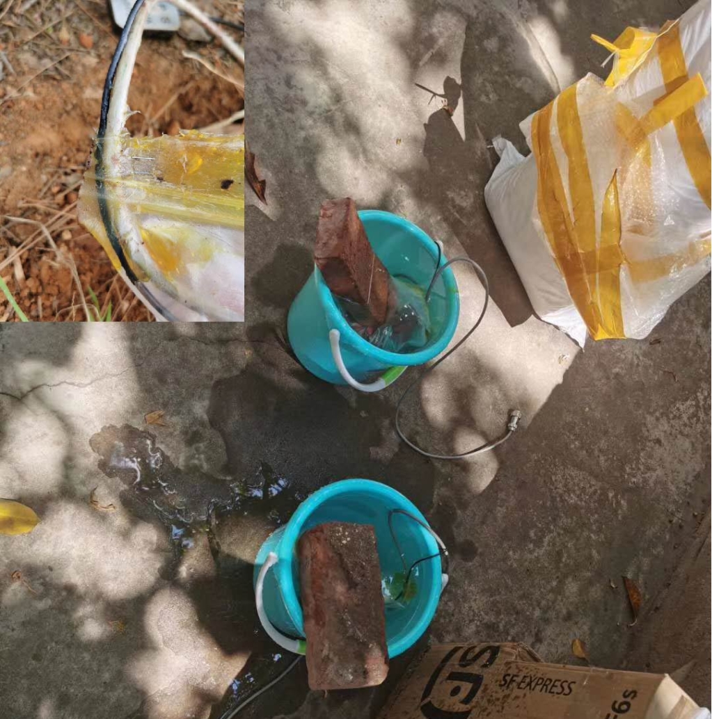 此外,吸取之前布台的经验教训,岳汉老师提出新的仪器和电池的防水方案,并提前进行了浸水测试。通过双封口透明塑料袋包裹仪器,并在两层封口中间涂满黄油;最后封口之前用订书钉固定袋口附近的电源线和GPS线,防止导线移动导致进水。在测试过程5个小时的浸水试验测试,验证方案的可行性。虽然布台过程因此变得“油腻”了很多,但效果显著。