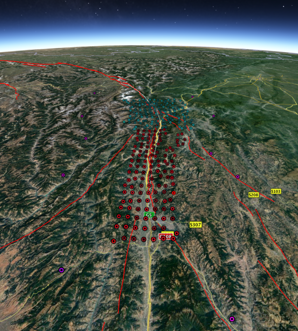 野外的第一步是选点,即确定每一个台站布设的空间位置。首先要考虑台阵本身的空间分布设计,比如像网格一样的均匀分布,又或者是局部加密等等。近年来各种密集台阵的观测日益增长,相关研究也得益于此有了突破性的进展。此次野外工作要完成的是以安宁河为中轴,沿两侧均匀分布的台阵。除了台网本身的设计之外,实际的地质情况以及道路分布也应被考虑在内。本次工作的区域均属于四川省凉山彝族自治州,群山巍峨,除了很小面积的山谷地区外,都要翻山越岭,道路的不确定性较高。出发前,我们根据台站间距需求选定了300+个可能的台站位置。