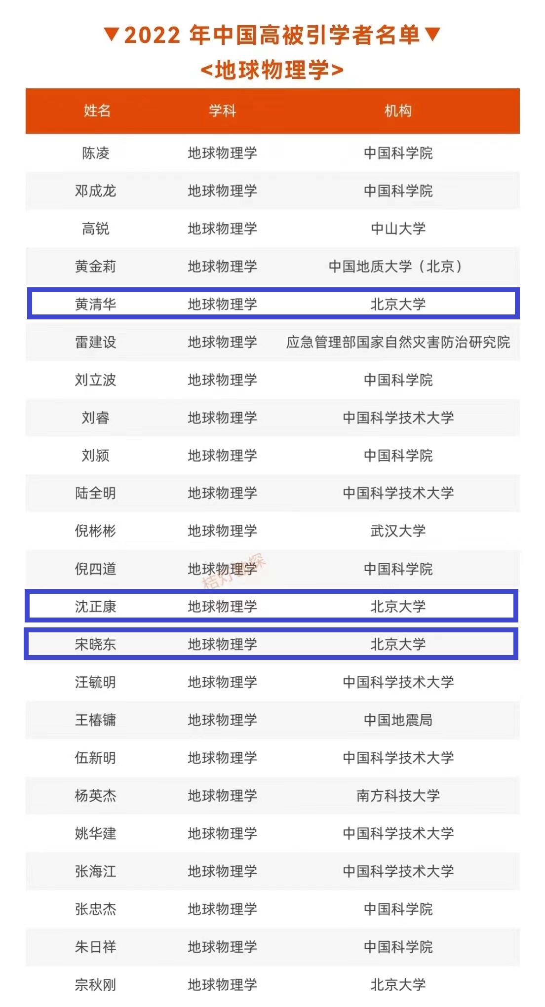 2023年3月28日,全球性信息分析公司爱思唯尔(Elsevier)正式发布了2022年中国高被引学者(Highly Cited Chinese Researchers)榜单。在地球物理学科的23位学者中,有本专业的黄清华、宋晓东和沈正康3位教授。