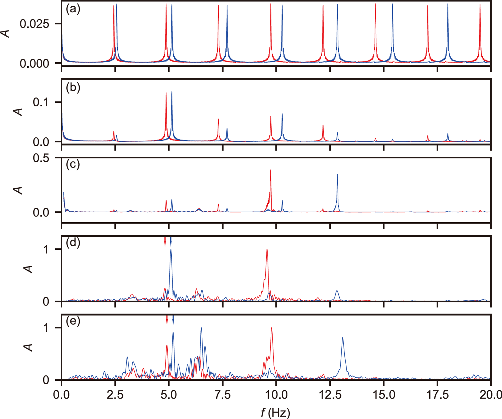(a) 单节车厢单组轮子;(b) 单节车厢4组轮子;(c) 多节车厢4组轮子。横轴是频率,纵轴是振幅谱的幅值。蓝色,车到前;红色,车到后。(d)和(e)中蓝色和红色箭头分别标明拾取到的车到前、车到后二倍桥频的位置