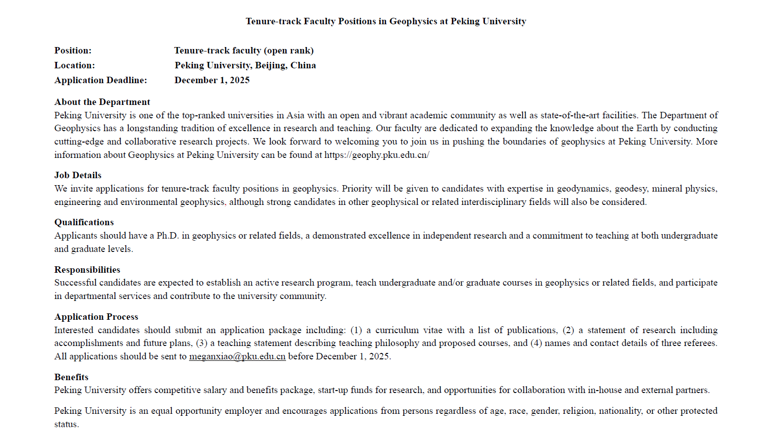 Tenure-track Faculty Positions in Geophysics at Peking University