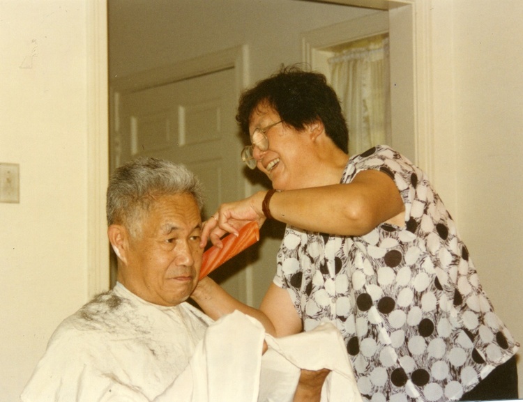 老伴儿给理发(1995年在美国休斯顿,二女儿鸣真家中)