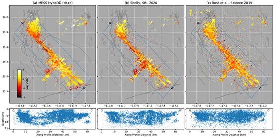 该工作最早应用于美国加州2019 Ridgecrest地震的余震检测中。余震检测结果与其他权威课题组(USGS, David Shelly and Caltech, Zach Ross)结果对比,达到了相当的检测能力和定位精度: