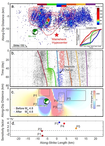 该工作同时指出,在九寨沟震源深度附近,存在一个对于应力变化较为敏感的区域。在较大的一次4.8级余震之后,该区域体现出了比较明显的活动性改变,与4.8级余震造成的库伦应力变化直接相关。同时该区域也体现出:1. b值较高,2. 余震活动性低,3. 同震破裂,4. 震后滑动集中的特点。通过断层摩擦物理学分析,我们指出该区域的特征摩擦参数