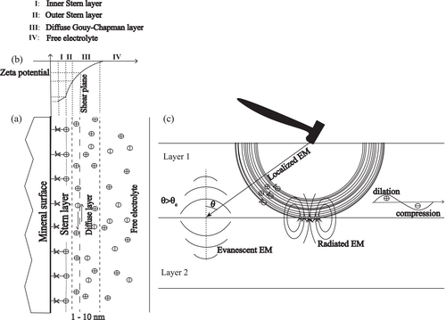 图1 震电转换产生电磁波的示意图。(a和b)双电层模型和对应的电位曲线示意图;(c)主动源地震引起的局部、界面辐射和隐失电磁波场示意图。
