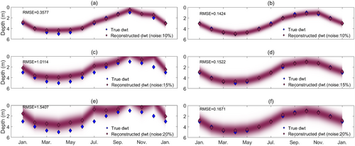 图2 真实的(蓝色)和预测的(紫色)潜水面深度的比较。左侧子图(a,c和e)显示使用26道SESRs数据反演潜水面深度结果,右侧子图(b,d和f)显示使用101道SESRs数据反演潜水面深度结果。第一行到第三行分别代表数据噪声水平为10%, 15% 和20%,图中阴影区域表示模型扰动水平。