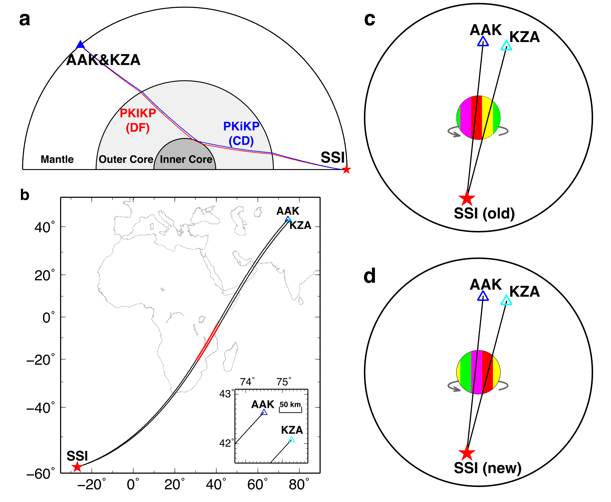 图1. 研究方法示意图。(a)内核震相射线路径的垂直剖面图,(b)射线路径在水平面投影图,红色线段代表穿透内核的路径,(c, d)横向不均一的内核结构及其在差速旋转时结构随时间变化被SSI地区的重复地震和吉尔吉斯坦的台站对(AAK和KZA)采样到。理想情况下,较早的SSI到AAK 采样到的内核结构(图c红色部分)会被较晚的重复地震到KZA再次采样到(图d红色部分)。