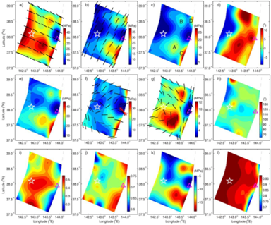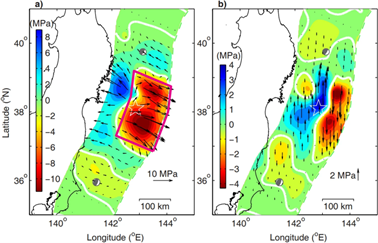 从恢复的断层破裂区的综合力学环境,他们得到了这次地震前后的绝对主应力的大小和方向、断层的孔隙压力(见文章的补充材料)、断层面上的绝对剪应力和有效正应力大小和方向、有效摩擦系数(图3)和孔隙压力比。他们发现力学环境变量在断层破裂区分布极不均匀,存在4个高有效主应力异常区(图2)和一个由两个剪应力和正应力异常区组成的大的应力“凹凸体”(图3),这个结果可以分别用他们得到的该处的孔隙压力低和摩擦系数、正应力高解释。这次地震和该区有关大地震的地震反射剖面揭示俯冲带的上表面存在地台-地堑地质构造,它有可能提供这个凹凸体存在的地质环境。地台处是火成岩,由于该处B值高(意味裂隙发育或孔隙率高)导致孔隙压力低,形成高有效应力区,在地堑处是沉积岩,由于该处B值低(意味裂隙欠发育或孔隙率低),形成低有效应力区。正是这种地质和力学环境孕育了这次9级海啸大地震。