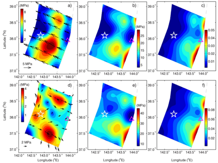 恢复的力学环境不但定量地解释了这次大地震导致的出乎意料的巨大海底位移和海啸;而且还定量地证明了前人有关断层区地震前后的主应力方向变化的定性分析,即最大主应力由震前接近水平方向变成震后近垂直方向,同时还给出了相应的应力在垂直方向增加值(12MPa)和水平方向减少值(16MPa)。 此外,他们还从力学上定量地解释了地震的孕育过程的剪应力变化和断层剪应力过冲(stress overshoot)现象。