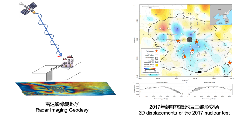 雷达影像测地学利用合成孔径雷达(SAR)发射的电磁波信号量测地表形变,如核试验地表三维形变场(Wang et al., Science , 2018)。